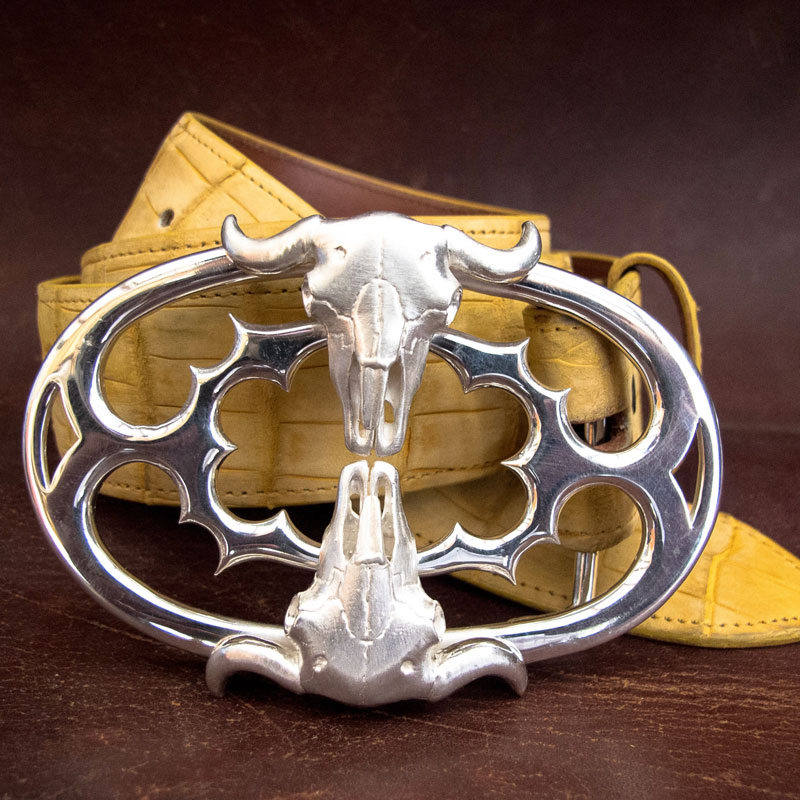 Limited to an edition of just 25 buckles, each sterling silver buckle is signed and numbered. Each skull is fully featured and connected to the base. Hinged loop holds up to a 1 1/2 inch strap, with peg closure. Straps sold separately.