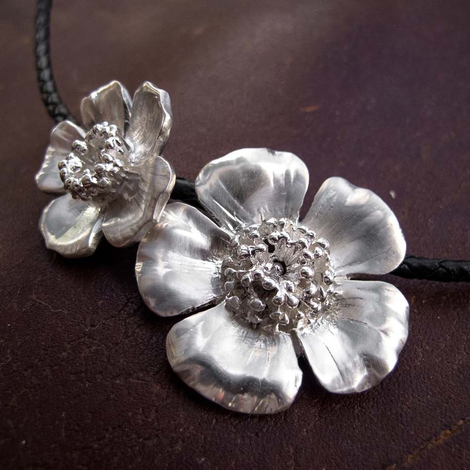 Sterling silver pendants strung on a black leather braided cord. The larger pendant measures 30mm in diameter and the smaller pendant measures 25mm in diameter. They are removable from the cord and can be worn together or separately.
