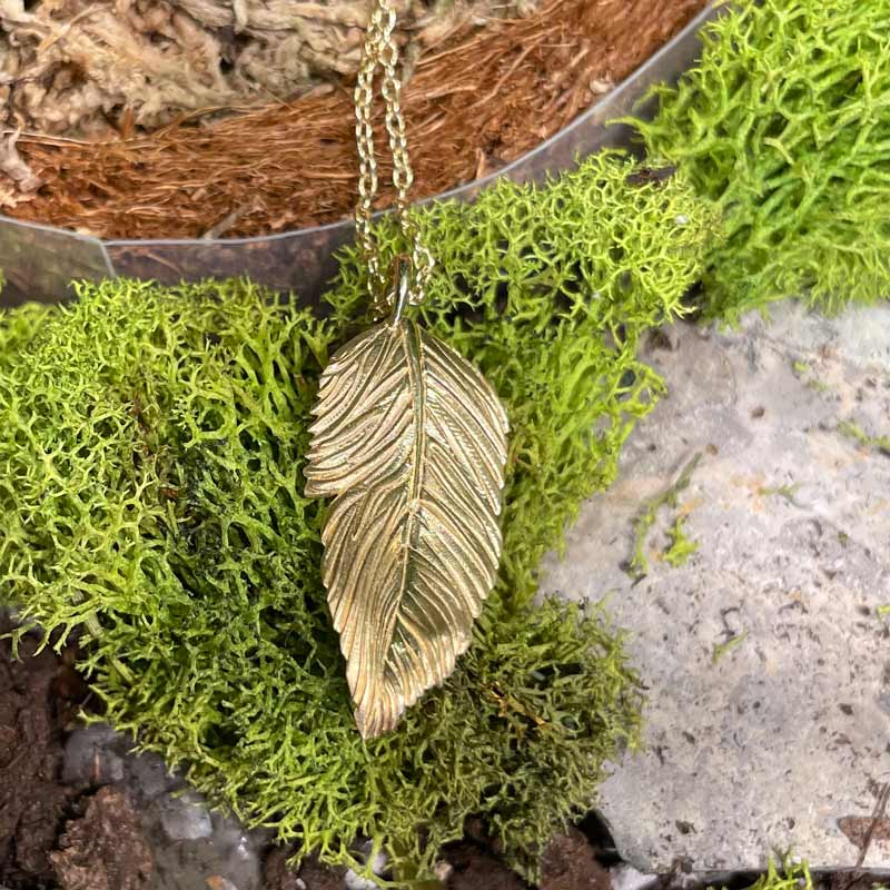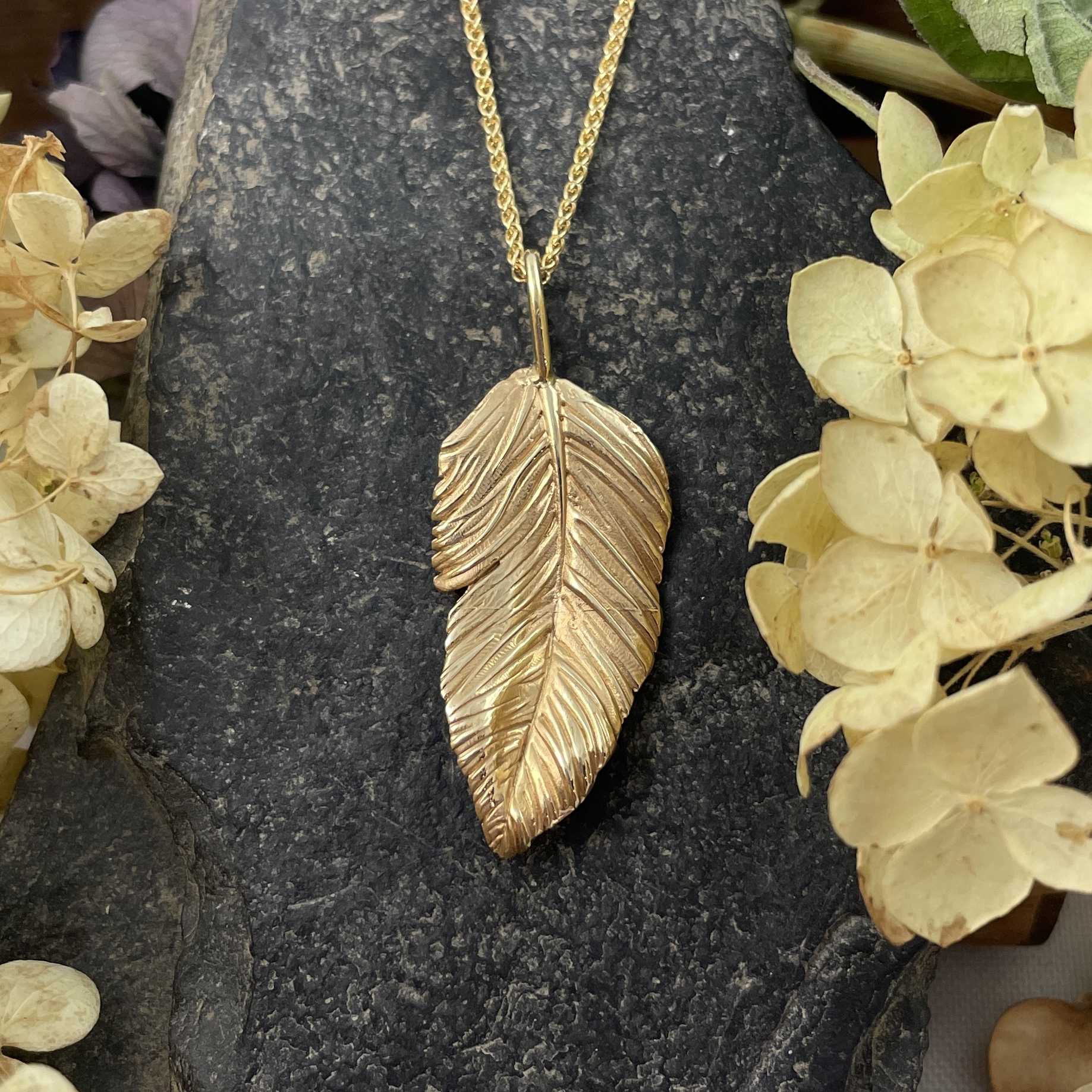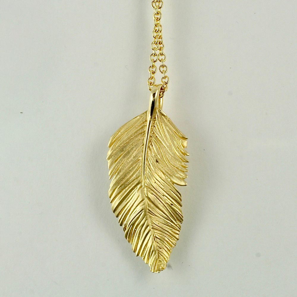 Feather pendant in 18K gold with cable chain, 1mm- specify 16 inches or 18 inches in length, soft matte finish with shiny bale and spine.
