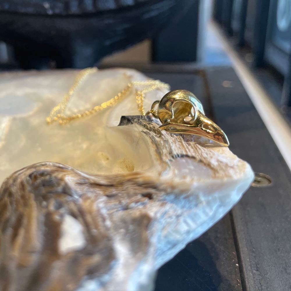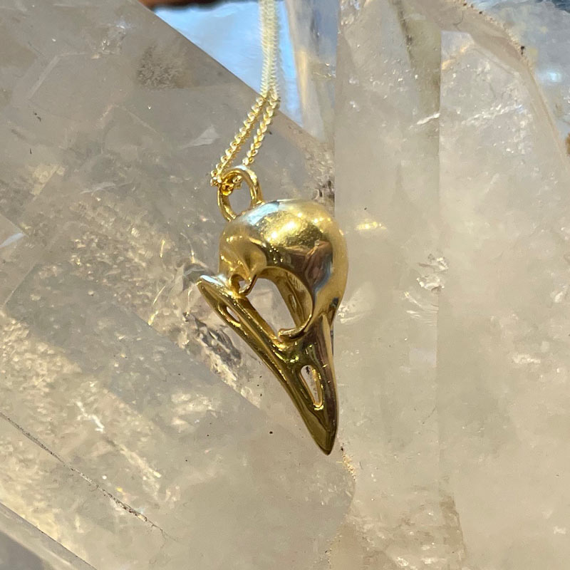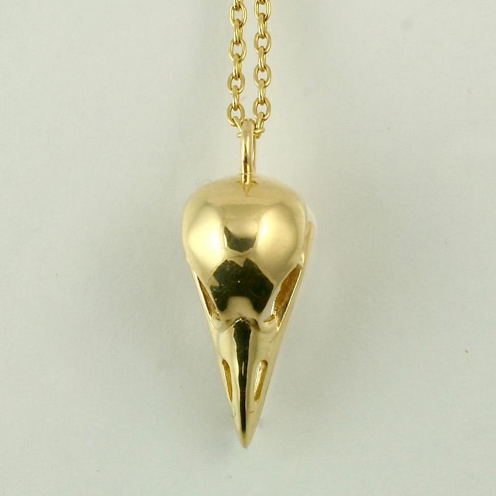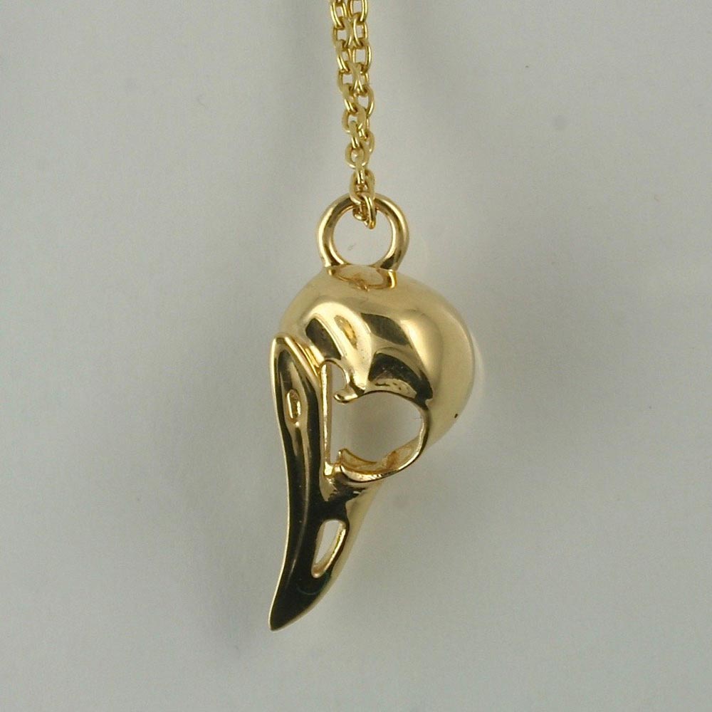 18K gold, fully dimensional bird skull pendant measures 20mm x 9mm plus the round bale (4mm) on 1mm cable chain, specify 16 inches or 18 inches.