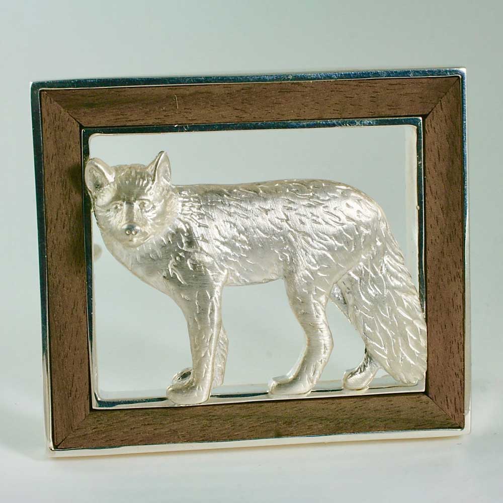 Limited to an edition of just 25 buckles, each sterling silver buckle is signed and numbered. The fox is fully featured and set within the frame. Hinged loop holds up to a 1 1/2 inch strap, with peg closure.