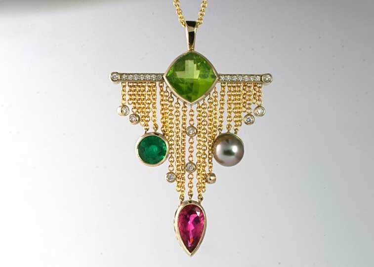 This custom designed pendant features birthstones of an August born Mother, children born in May and June, and an October born Father.