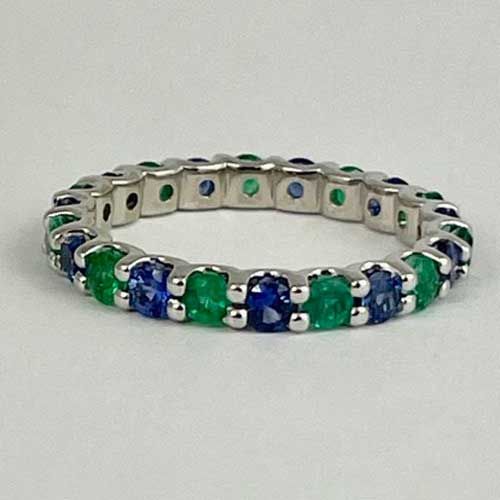 This classic eternity band celebrates September and May born children with emeralds and sapphires.