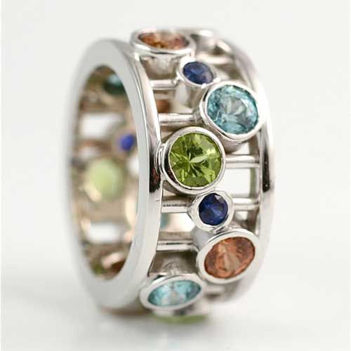 This custom ring incorporates birthstones of family members born in August, September, November and December